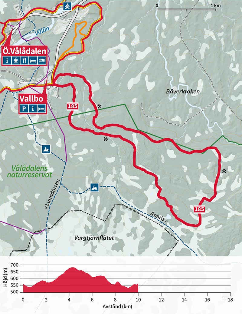 Starta vid ledparkeringen i Vallbo, kliv på spåret ute på fältet och kör i riktning mot byn. Spåret går mellan Per-Olsgården och Vallbo Fjällgård. När du har svängt runt ett garage glider du österut över Utterbäcken. Det smala spåret fortsätter genom gammelskog där du har stor chans att se spår efter olika djur. Du skidar i lätt motlut genom granskog och över myrmark i fyra kilometer. Passa på att pausa med utsikt över Anarisfjällen i sydost.